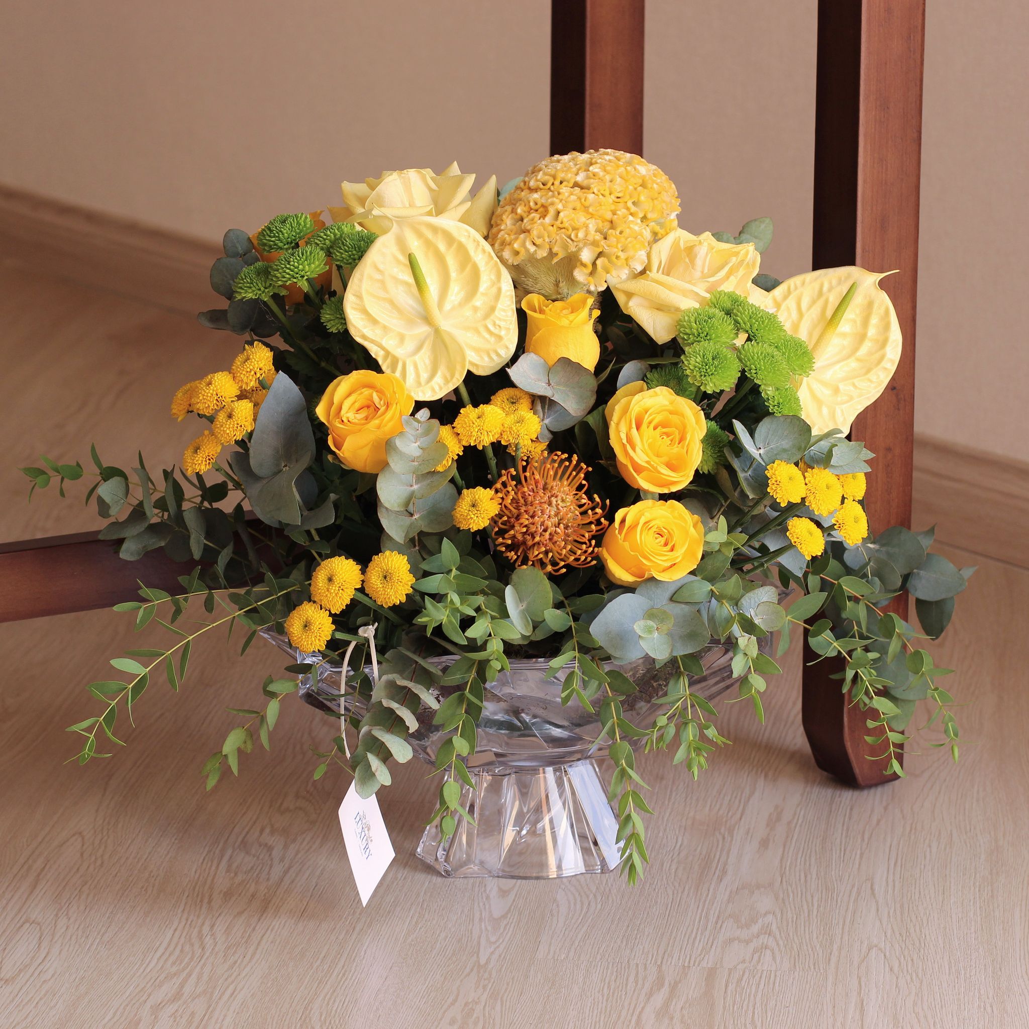 The gorgeous flower arrangement with mix of kinds of flowers that will lighten up your home,such as anthurium yellow,celosia yellow,rose yellow,green buttons,yellow buttons,peach pinchusion,ecalyptus and italian ruscus.