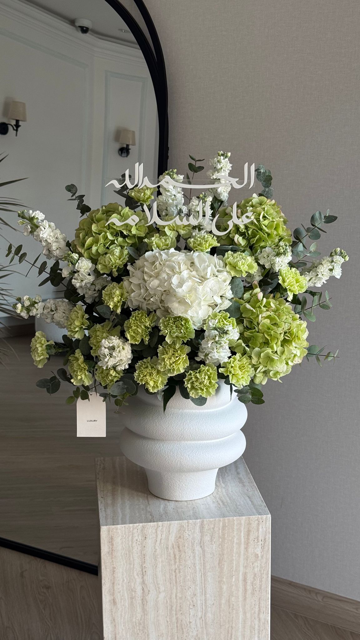 A refined floral arrangement featuring lush hydrangea paired with green and white carnation with our signature logo.