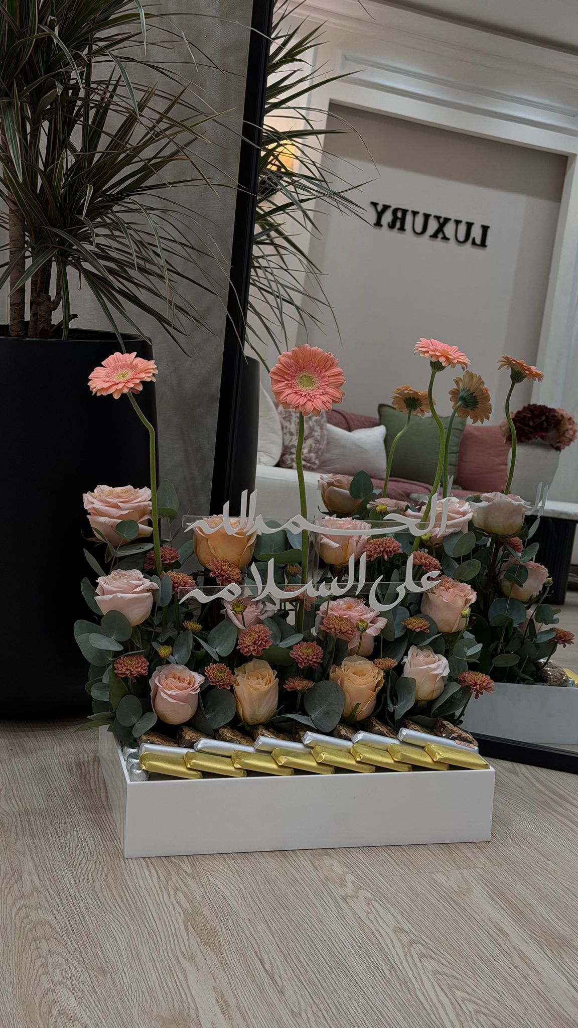 A vibrant arrangement of classic roses and cheerful gerbera and buttons.thoughtfully combined to create a perfect balance of elegance and joy,with premium chocolates and logo.